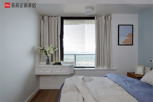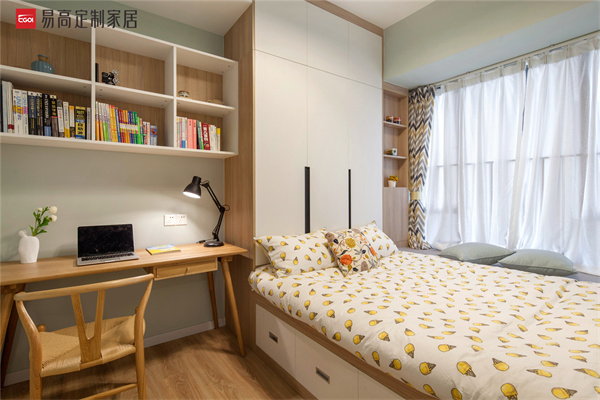 書桌靠窗,定制一排書桌,翹腳定制收納柜,書桌的通風(fēng)采光效果也是非常棒的,視野效果更是一絕。辦公看書累了就可以抬眼看看遠(yuǎn)處的風(fēng)景,舒展一下身心。臥室空間比較充足的話可以考慮設(shè)計(jì)兩個飄窗,一個辦公看書,定制書桌書柜,一個休閑娛樂,定制一個榻榻米,休閑娛樂兩不誤。